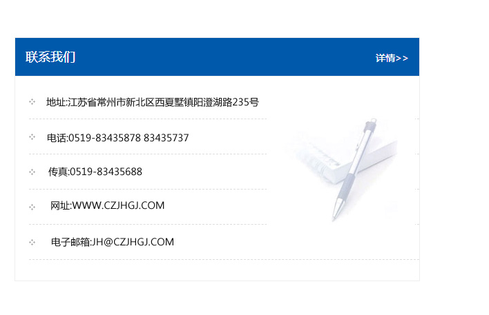 地址:常州市新北區友邦商務大廈1幢16、17層  電話:0519-85101652  傳真:0519-85112595  郵編:213022  網址:www.cz-jiayue_cn.syyggrjc.com  郵箱:xiajifengaa@163.com